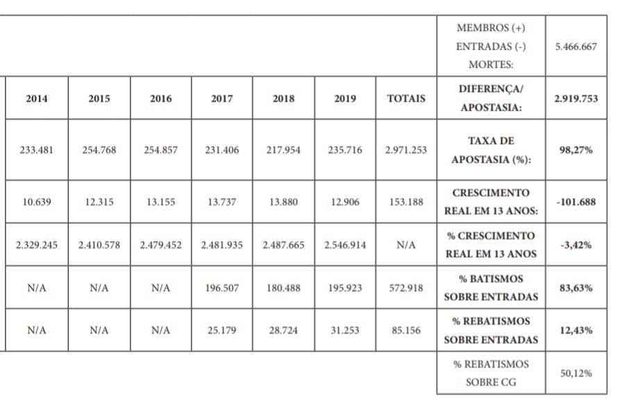 A taxa de apostasia é de 98%. Significa que quase todos os batizados de 2006 não estão mais na igreja em 2019.