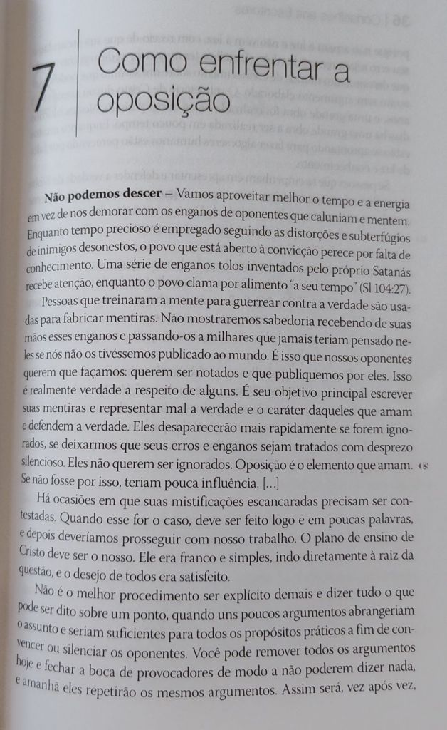 Conselhos aos Escritores páginas 35-36. Observação: o tempo deve ser gasto pregando as 3 mensagens angélicas e não debatendo com opositores. Deve ser dada uma resposta breve e deixá-los se afundar na repetição dos mesmos argumentos e mentiras