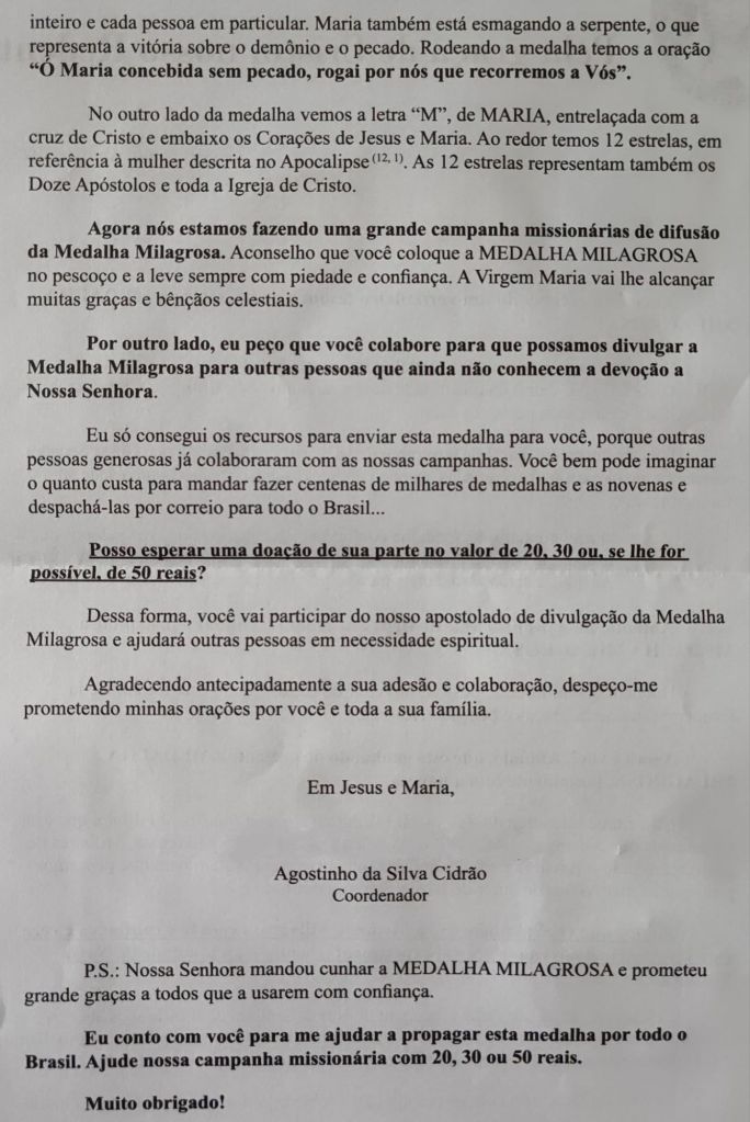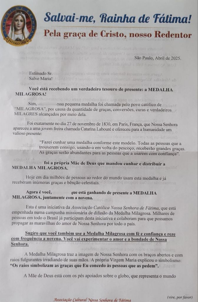 Eles fingem ser os santos catolicos. E falam coisas como “Façam medalhas milagrosas”.