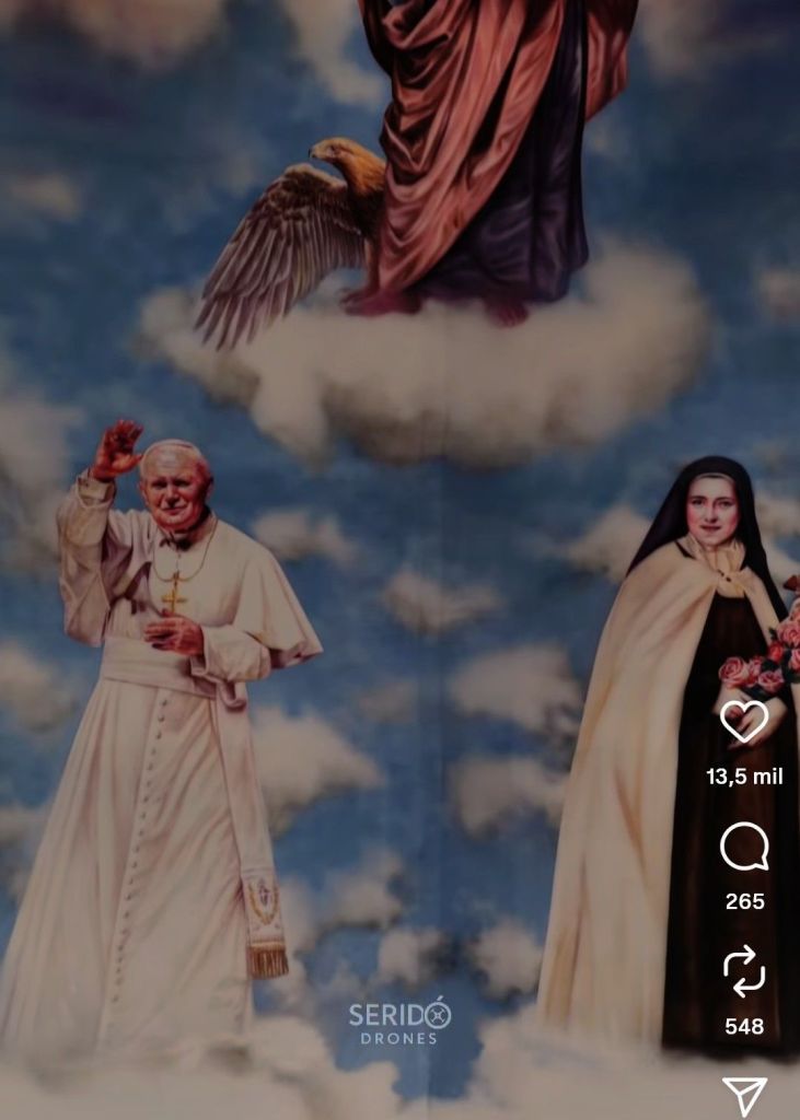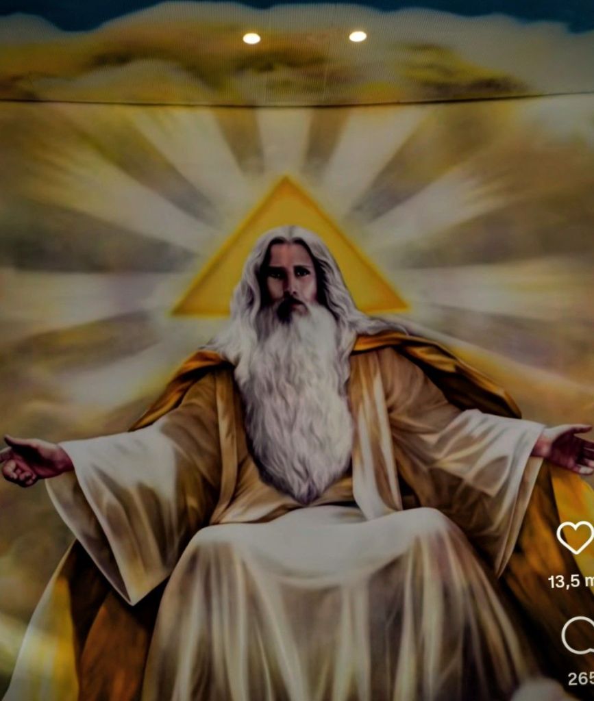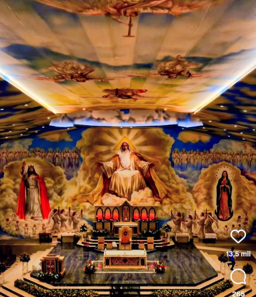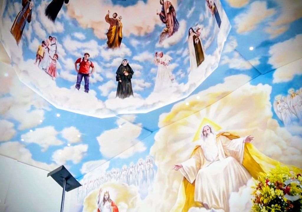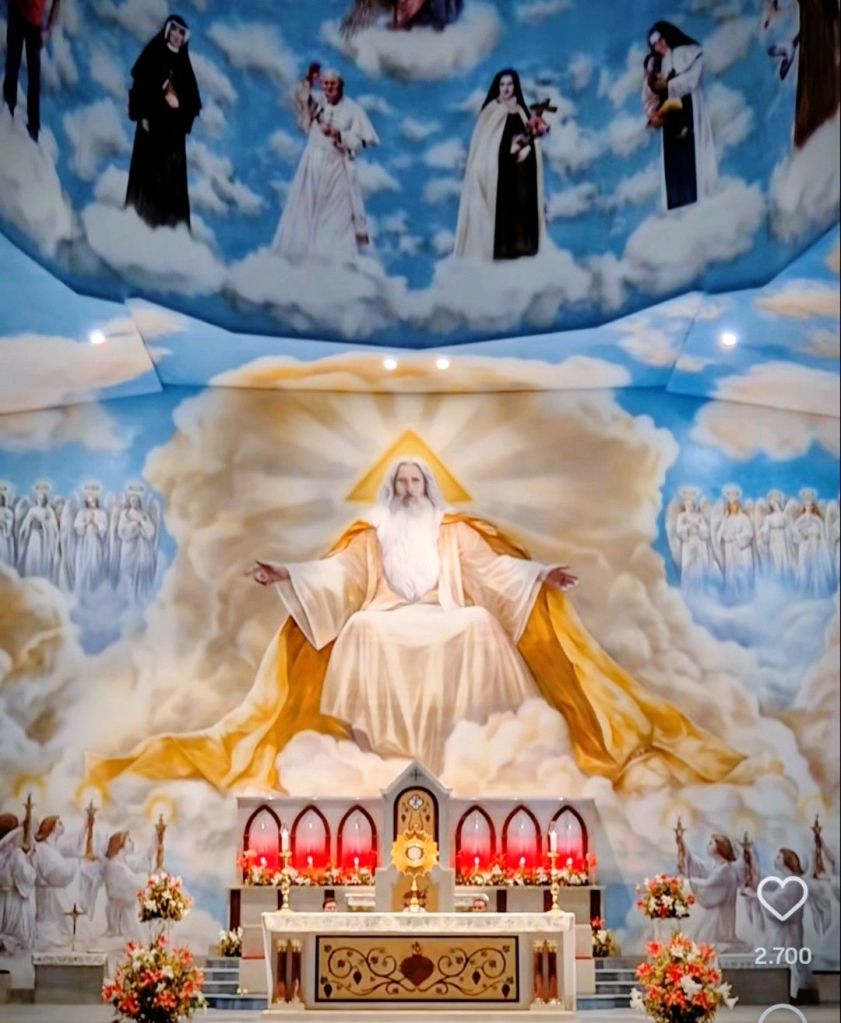 Ninguém viu a Deus, diz o Novo Testamento. O Pai não deve ser representado em forma humana. Ele não é humano. Embora a humanidade seja feita em sua imagem e semelhança não devemos representá-lo. Além do pecado de representar Deus O Pai também colocaram todos os santos mais famosos ao redor inclusive o santo de calça jeans Carlos Acutis, reforçando a mentira da imortalidade da alma e a mentira da intercessão dos santos mortos.