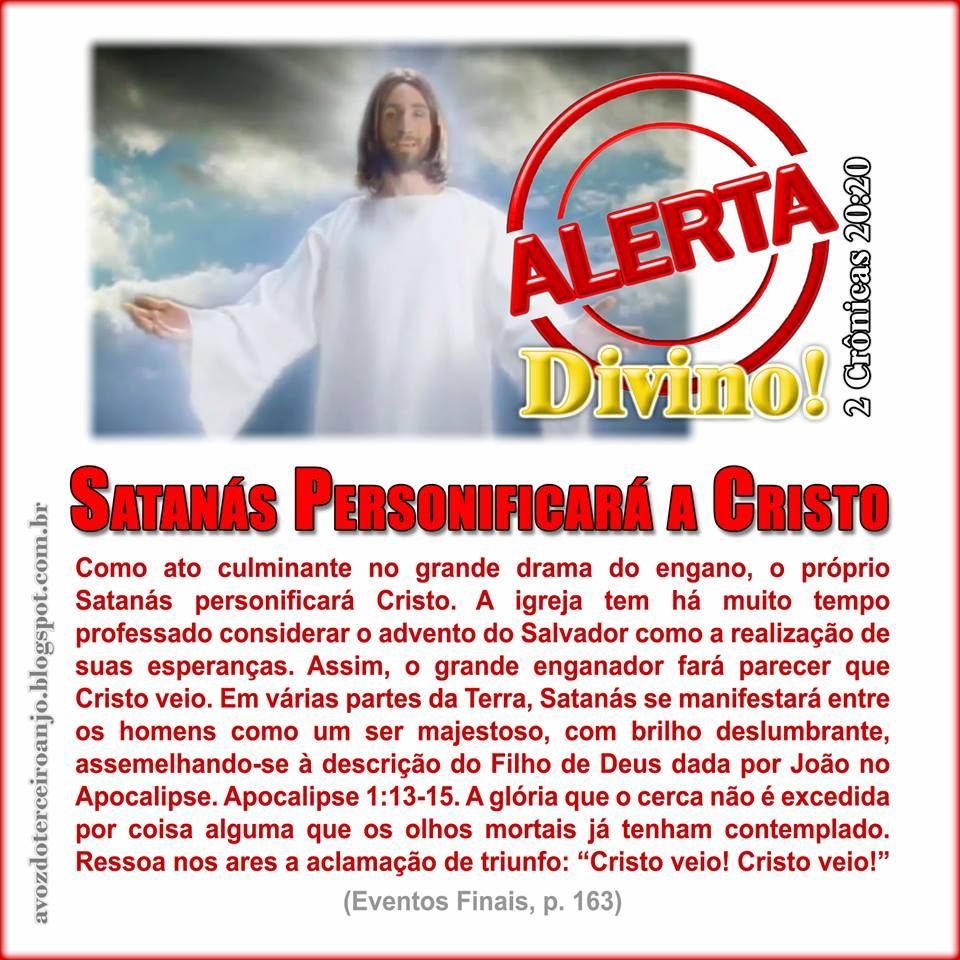 10.4- QUINTA PRAGA – 3 dias de escuridão sobre o Vaticano. Satanás “acaba” com os 3 dias de escuridão da quinta praga sobre o Vaticano (apocalipse 16) e as sombras dos enxames de anjos maus. Se disfarça de Jesus Cristo e desce nas nuvens do céu até a Terra. Pisa no chão. (Talvez descendo de uma nave literal). Vem com um grupo pequeno de santos falsos (Maria, Pedro) e anjos falsos (Gabriel). Afirma que mudou a Lei de Deus. O mundo o segue. (II Tessa 2:7-12). As aparições são episódicas (cada dia em uma parte do mundo). Ele vai até os Presidentes e Reis . Aclamação mundial. ”Todo o mundo está salvo”, – garante Papa, Reis, Governadores e Prefeitos.